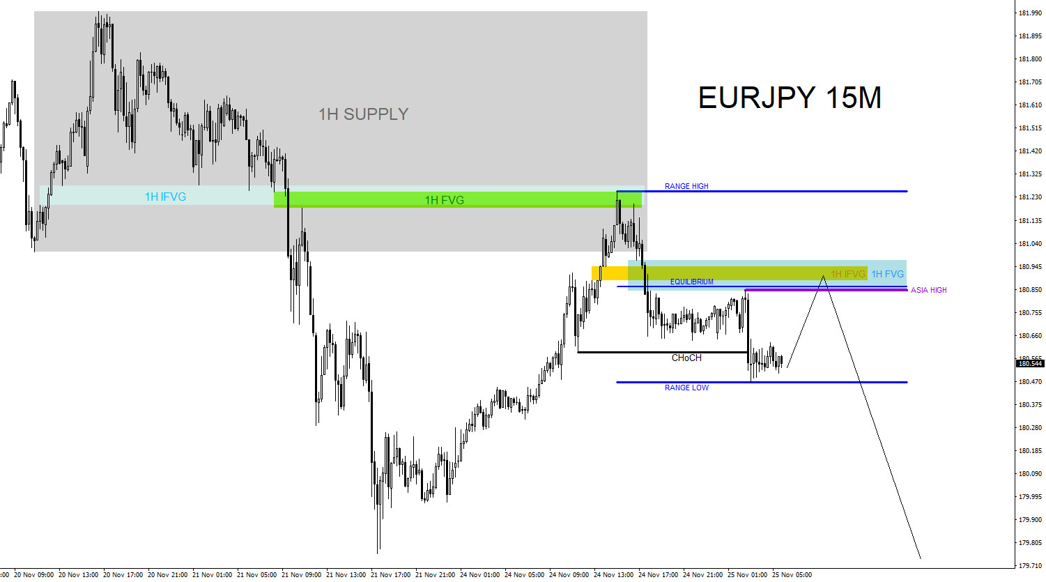 ACTION: Any move higher above the equilibrium level traders can then look for possible selling opportunities. I will be looking for sells in the 1 Hour FVG and 1 Hour IFVG zones above the Asia high. The pair can extend lower without tapping these zones so I will only sell if price tags these zones. If price tags the zones and get sell entry the target will be the November 21 2025 low and stops will be placed near the range high.