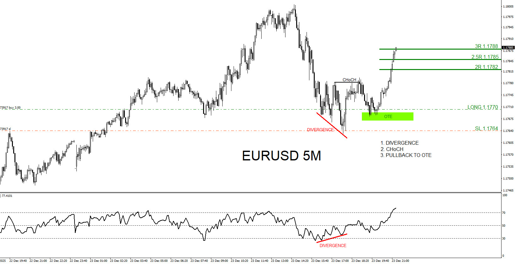 On the pullback lower to the OTE Zone/Optimal Trade Entry Zone (Green Box) is when I entered the buy/long trade at 1.1770 with a tight 6 pip stop loss at 1.1764 and expected for a push higher to the 2R and 3R targets.