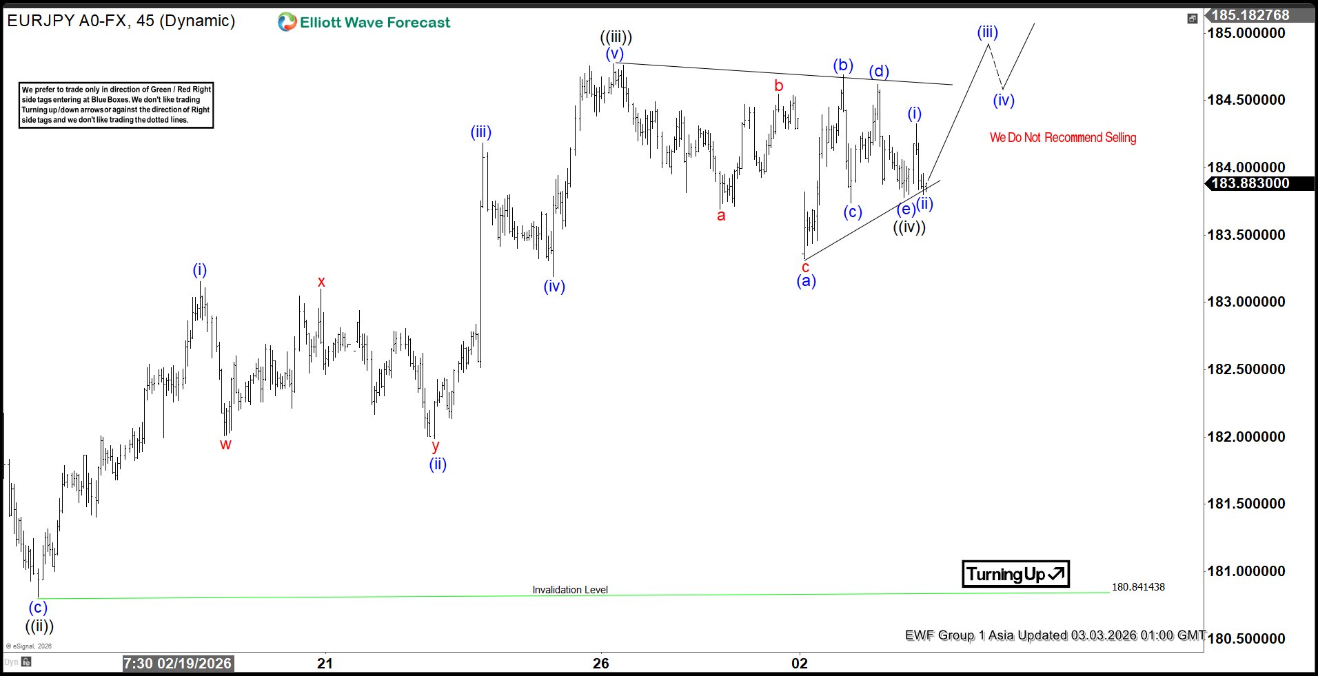 The short-term Elliott Wave structure in EURJPY continues to indicate a bullish trend. Examination of the 45‑minute chart reveals that the pullback from the wave ((iii)) high unfolded in three distinct waves. This formation suggests a corrective nature rather than the beginning of a larger reversal. Thereby, it supports the expectations of further upside momentum. The rally from the February 13 low is proposed to develop as a five‑wave impulse.
