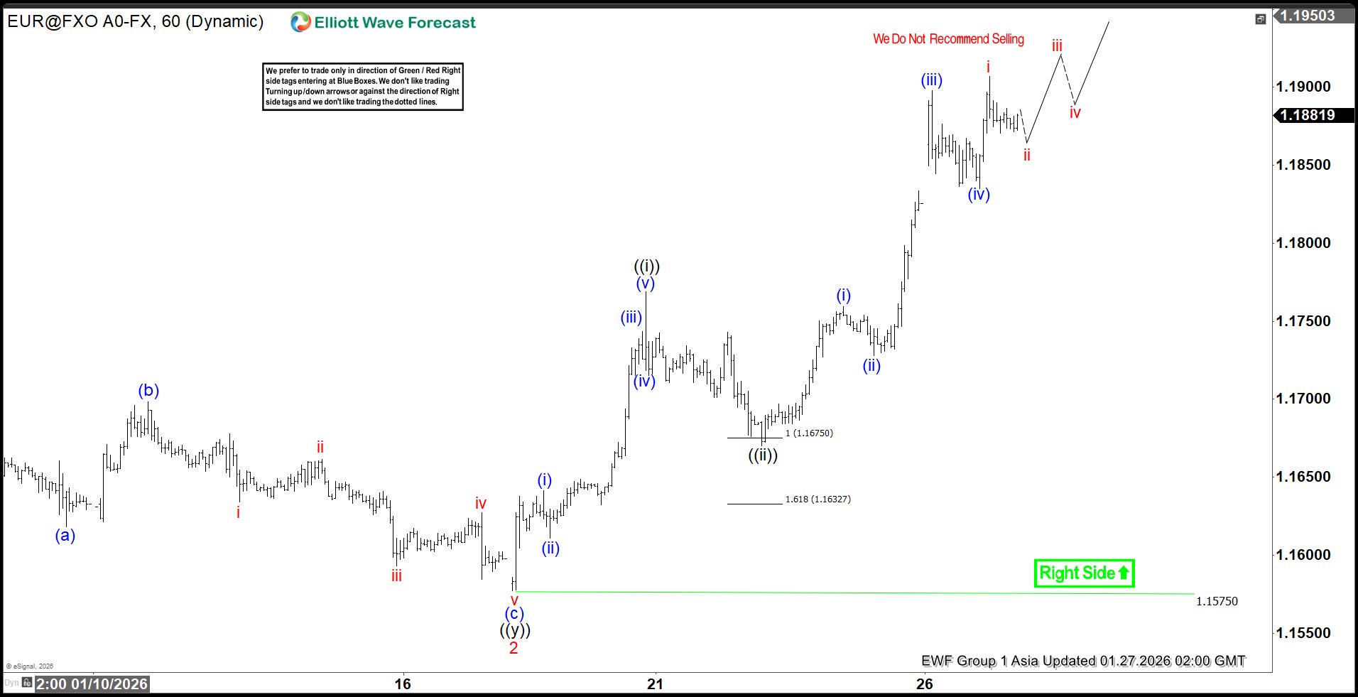From the peak of wave 1, wave ((w)) ended at 1.1659, followed by a corrective rally in wave ((x)) that terminated at 1.1742. The final leg of the correction, wave ((y)), pushed lower and ended at 1.1575. This completed wave 2 at a higher degree and set the stage for renewed upside momentum. Since then, the pair has resumed higher in wave 3, confirming the impulsive structure.