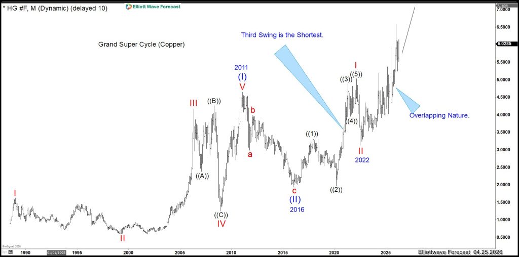 Looking at Copper on the monthly timeframe, we identify a completed cycle in 2011, labeled as wave (I), followed by a corrective wave (II) ending in 2016. From the 2016 lows, the market produced a clear five-wave advance into March 7, 2022, which we label as wave I, followed by a correction into the 2022 lows as wave II.