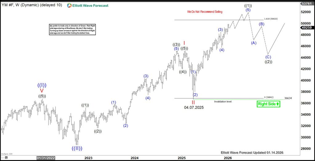 Dow Futures (YM) weekly Elliott Wave chart suggests the advance from the April 7, 2025 low is completing a 5-wave impulse. The cycle should likely finish in the first quarter of 2026, leading to a significant corrective pullback in 3, 7, or 11 swings. Provided the 36,634 pivot remains intact, the correction should hold support and pave the way for further gains.