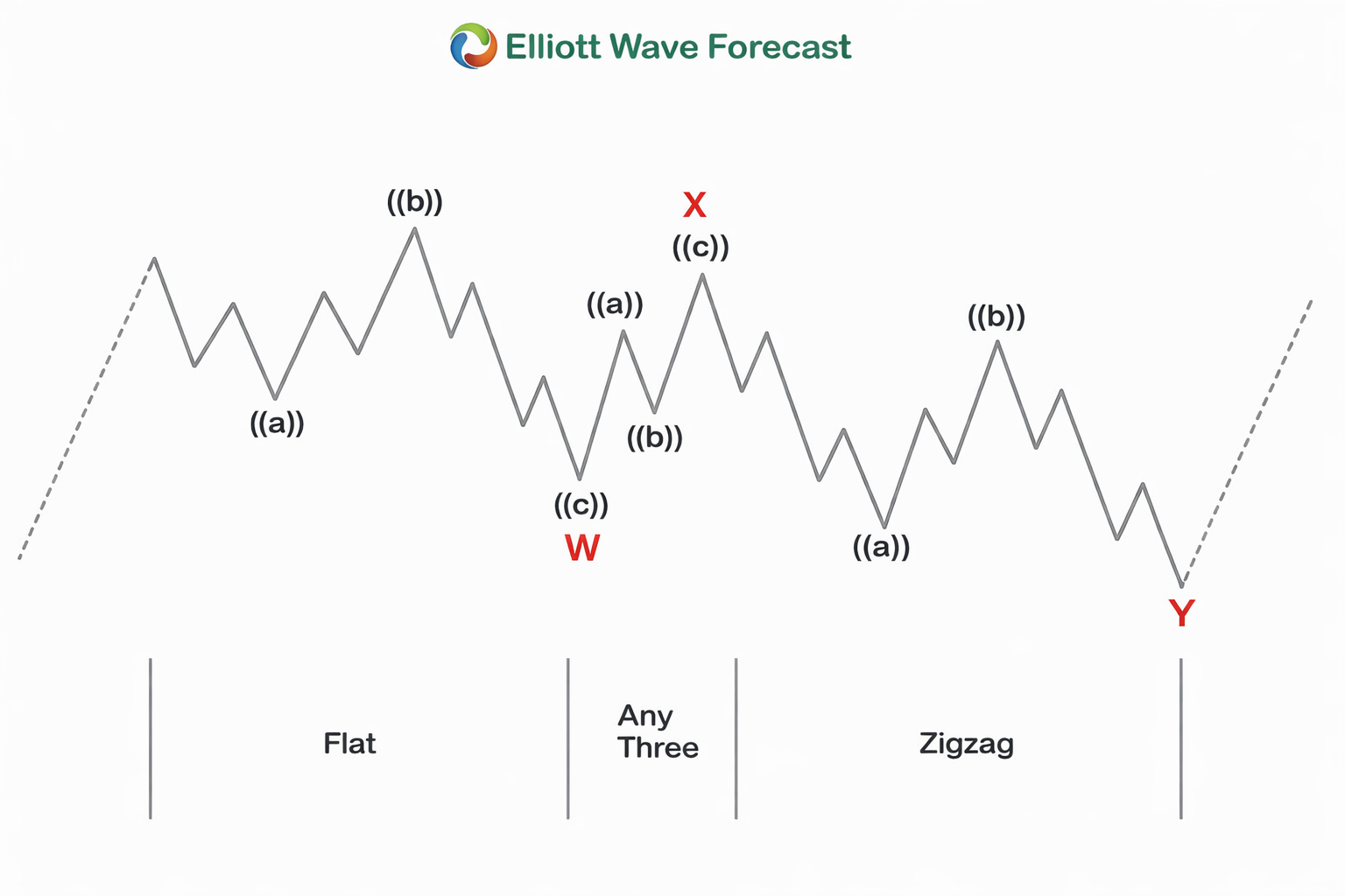 Double and triple combinations are complex corrective patterns that occur when the market fails to complete a simple correction and instead extends sideways.