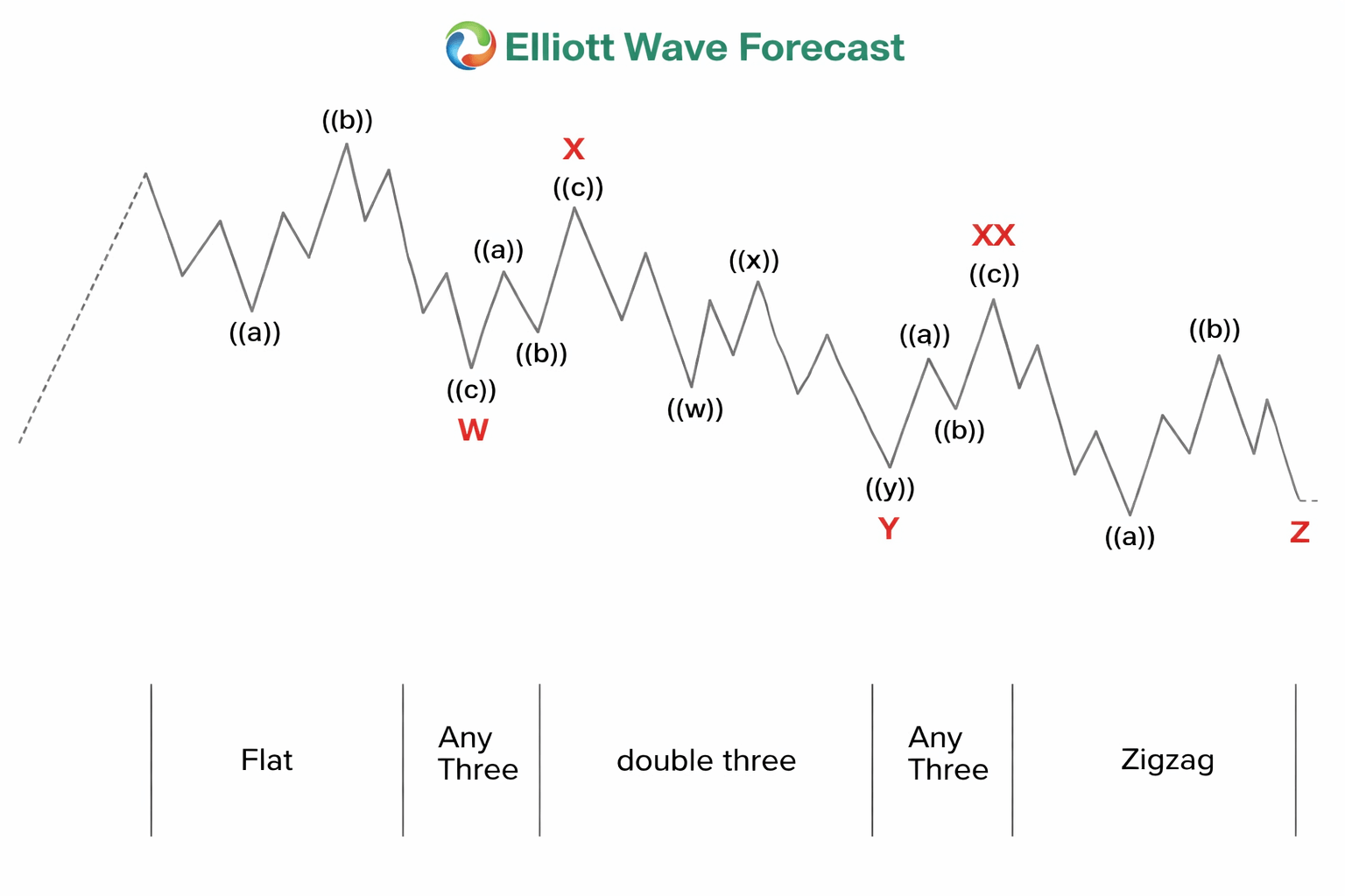 These patterns are composed of multiple corrective structures connected by “X waves,” which act as linking phases between corrections. These are advanced corrective wave patterns that extend beyond simple corrections.