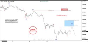 The Index has turned lower in wave 3. Down from wave 2, wave (i) ended at 104.63 and wave (ii) rally ended at 104.89. The Index then nested lower with wave i of (iii) ended at 104.36. Wave ii of (iii) ended at 104.76. The Index extended lower in wave iii towards 104.14 and wave iv ended at 104.25. Wave v lower ended at 103.99 which completed wave (iii). Near term, as far as pivot at 105.18 high stays intact, expect short term rally to fail in 3, 7, or 11 swing for further downside.